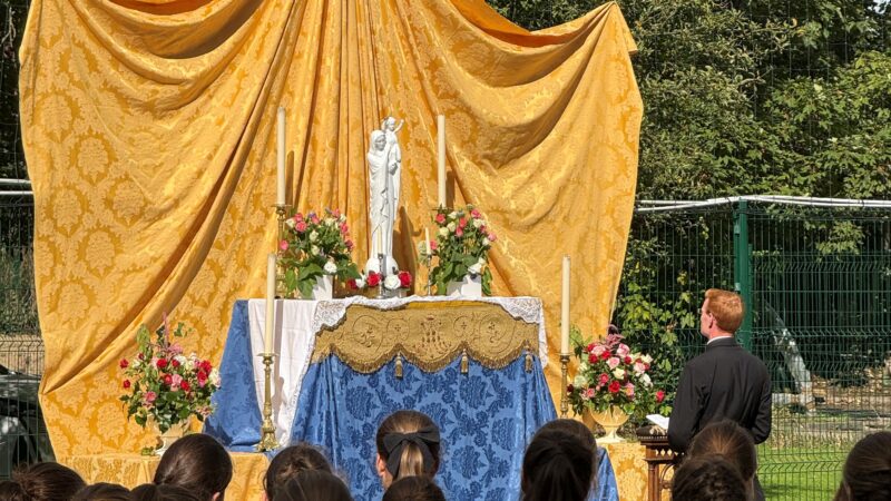 Les élèves apprennent à travailler sous le regard de Dieu par la prière quotidienne en classe et la présence permanente du Très Saint Sacrement dans les trois bâtiments du groupe scolaire.